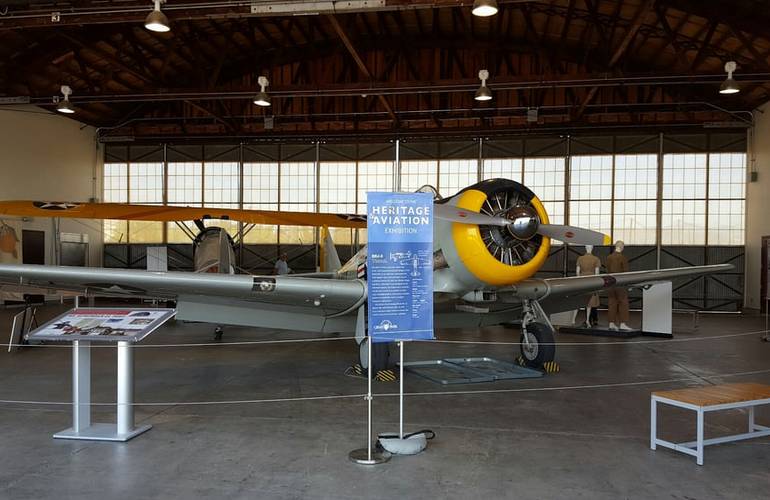 The Palm Court Arts Complex is a canopy of date palms with various artworks and sculptures on display. Hanger 224, an original building from El Toro Marine Airbase, is adjacent to the Palm Court and is used for events and displays historic aircraft and artifacts.