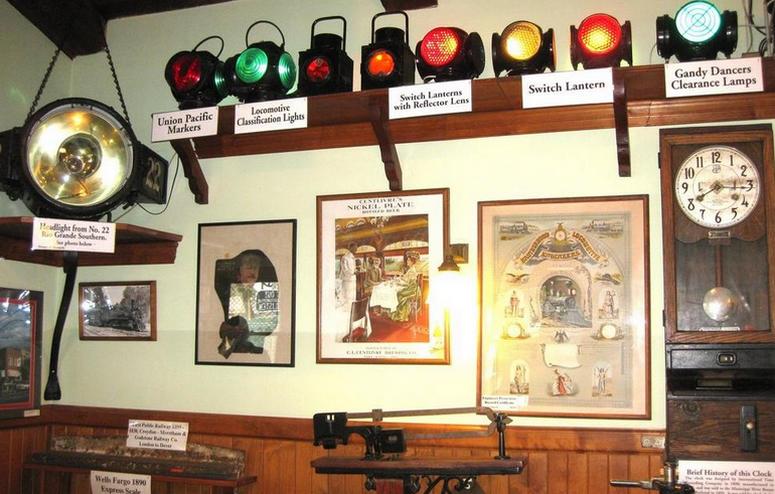 Inside the train depot, a collection of railway artifacts includes conductor hats, railroad lanterns, spikes, clocks, whistles, and photographs. Additionally, a small gift shop offers toys, hats, T-shirts, and train patches. There is also a table set up with a wooden train for toddlers, making it a perfect play area for young children.